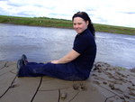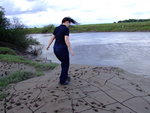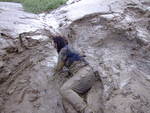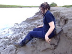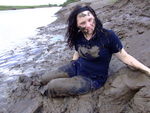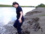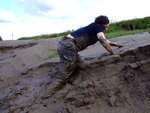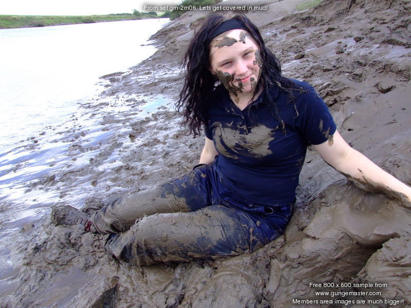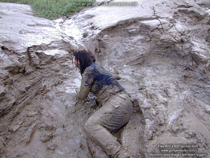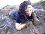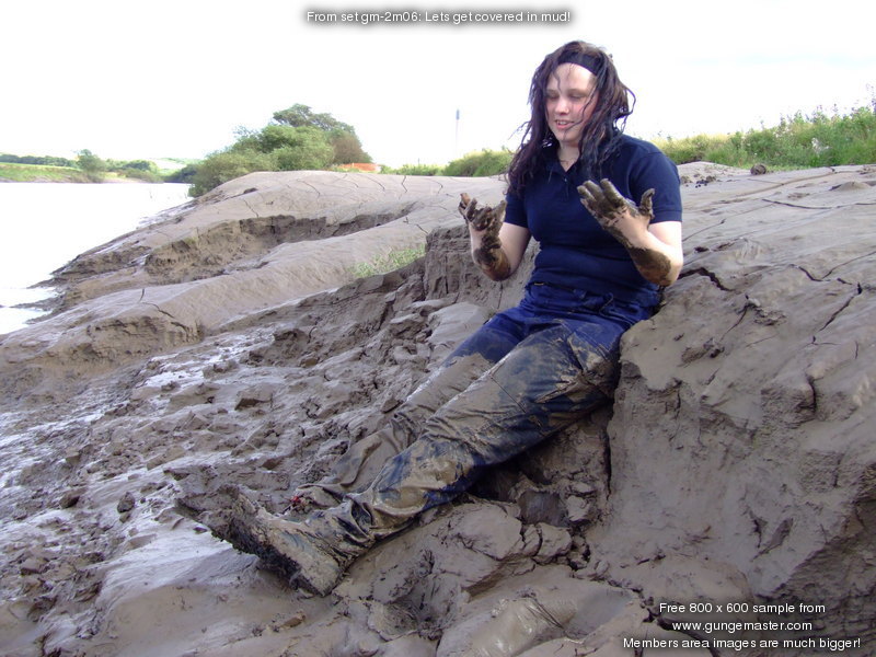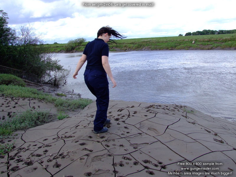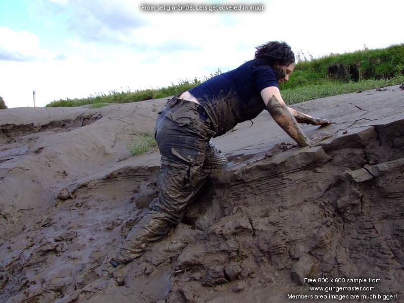Wendy wears practical working boots, navy blue combat trousers, and a navy blue polo shirt into the mudbanks, sitting down, sliding from dryer mud down into the sloppy stuff on her bottom, crawling back out again and then sliding back in. Slowly and methodically she totally covers her clothes in mud, and streaks some of it onto her face too!