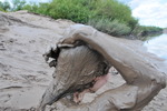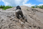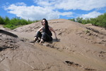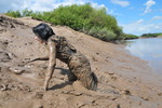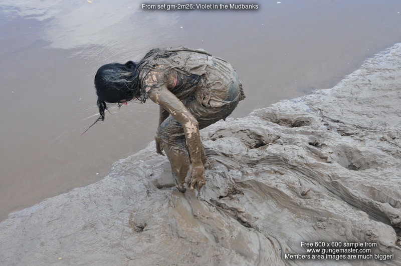 She walks into the mud, sinking a little further with each step, until she gets stuck, and then falls back with a splat, planting her bottom firmly in the clay. She gets herself free, and then gradually gets muddier and muddier, sitting down in the sloppy parts, crawling back up the gully on her knees and sliding back down on her bottom, eventually lying down on her back and then rolling over towards the camera, rolling the still-clean front of her dungarees into the mud, and then dragging herself along through the slopiest bits on her font.