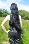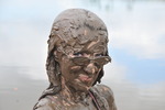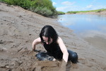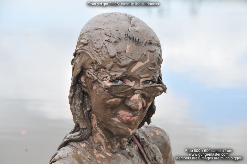 Her thigh-length black hair doesn't escape, initially just getting a bit muddy as she sits and slides about it the mud, but eventually she gives herself a thorough mud shampoo, ensuring every strand is coated, as well as giving herself a full mud facial, with her glasses on and covering them in mud too.