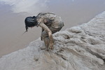 She slides down the gully several times, before eventually taking a bucket of river water up to the top of the adjacent slope and pouring it down as lubrication before taking several high-speed slides all the way down the mud slope to the edge of the river before climbing back up and doing it again. She does this while totally covered in mud from head to toe.
