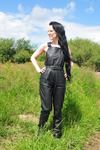 Violet dressed in a pair of Marks and Spencer black pleather dungaress, worn over a black and pink swimsuit, with black plimsolls, and kept her glasses on too.