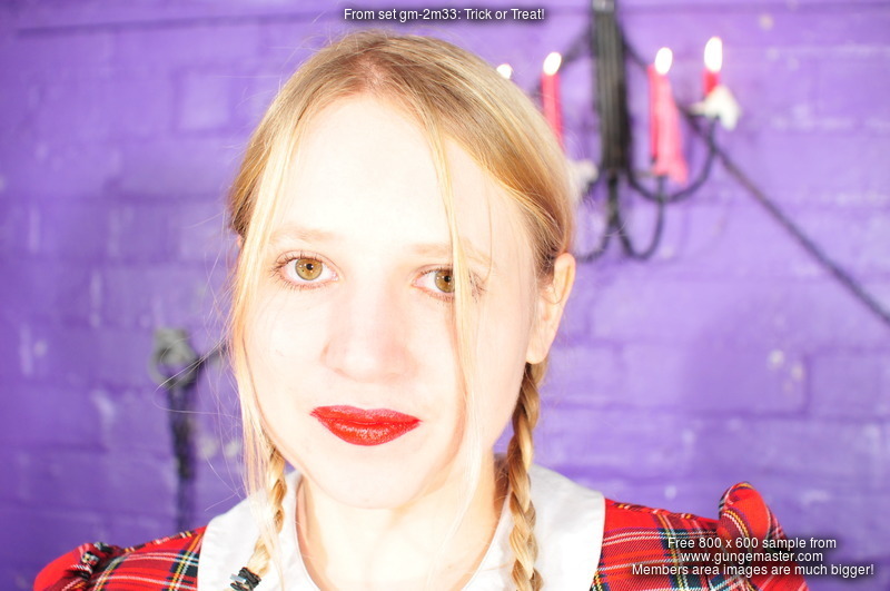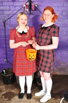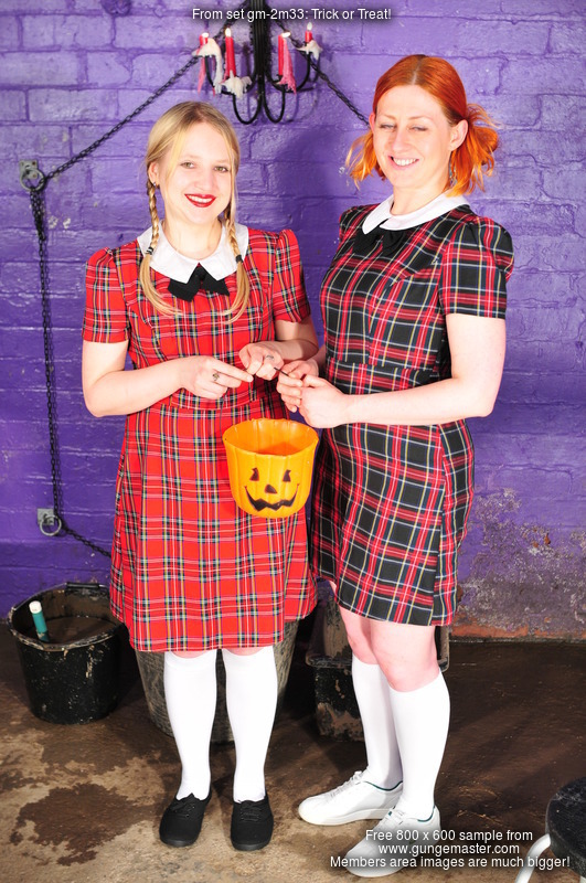 Felicity wears a red tartan dress with white collar, knee-high white socks, and black plimsolls, while Rosemary wears a black and red tartan dress, knee-high white socks, and white Lacoste trainers. They start out playing scissors-paper-stone, except that what they actually say is "trick-or-treat", with the winner getting to dump a trowel-full of mud into the bucket. Except that whoever gets to four wins first will then get to dump the contents of the bucket on the other girl's nice clean dress!