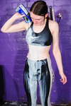 The lovely, willowy, Chastity, dressed in skin tight black and white spandex leggings and a Nike sports-bra top and wearing white sparkly plimsolls with no socks, completely drenches her outfit and shoes in litres of milk. She pours lots of milk into her leggings front and back, it leaks through the tight fabric and floods down her legs, she also pours milk inside the sports bra from where it flows down her skin and all over her leggings, and she also pours lots of milk all over the outside of her outfit and over her skin.