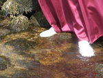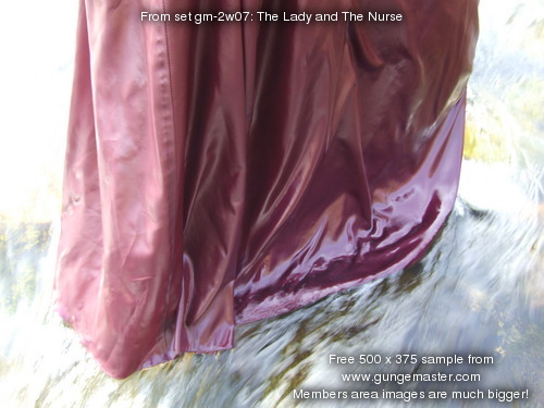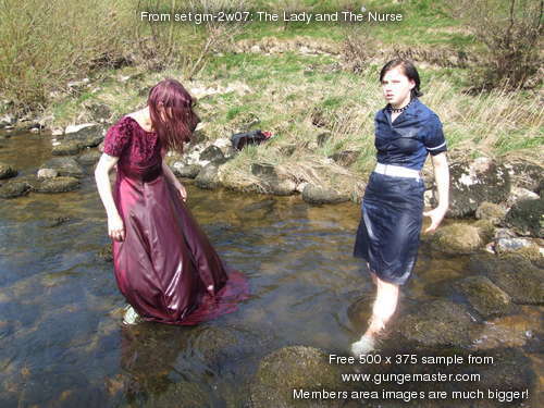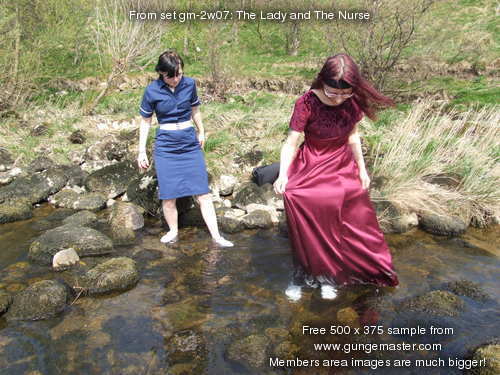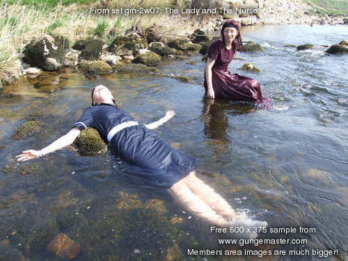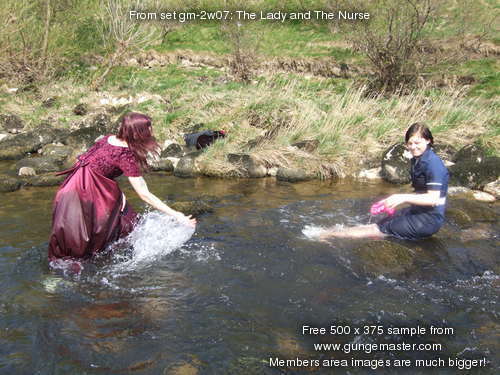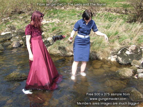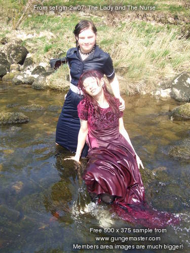 Both women end up totally soaked to the skin as they experiment with various locations and pools, Lady Jasmine taking a delight in lying down in the water, feeling her dress ripple and flow as the river flows over her, while Nurse Wendy loves to sit in her dress in the pools and under the bridge, splashing and being splashed until she's completely drenched.