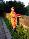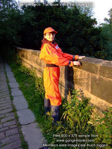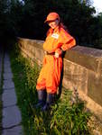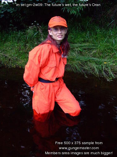 Satisfied with her handywork, Lady Jasmine poses for a while in the water, relaxing as the river water flows through her coveralls.