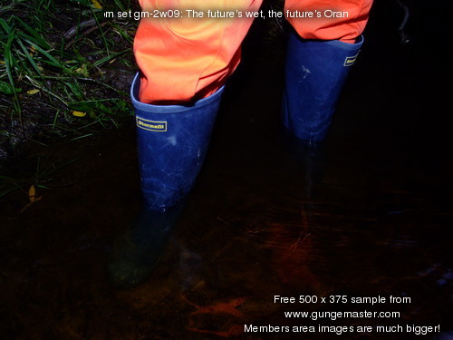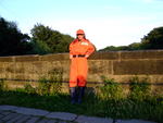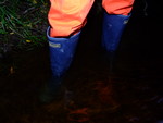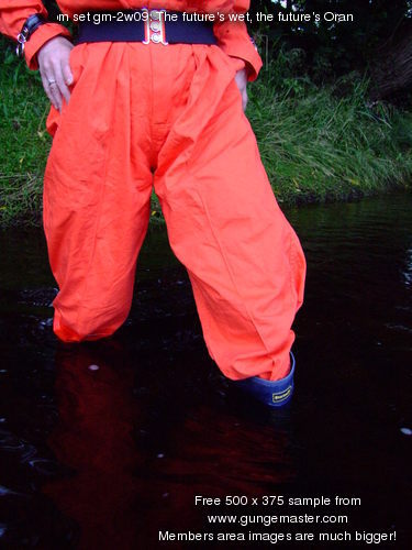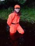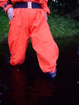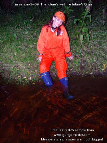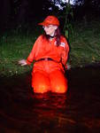 She wades into the river slowly, taking time to flood her blue wellington boots one at a time, then, with both boots filled and the river lapping at the legs of her coverall, she bends one knee, soaking her right leg to mid-thigh, and splashes water up onto her suit. She stands up, boot-tops just under the water, and goes on splashing herself until the front of the legs and trunk of her coverall are soaked.