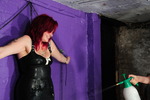 Miss Pink wears a tight fitting latex skirt and top, with heeled shoes, and is properly chained to the dungeon wall by both her arms and her legs in loops of steel chain. Felicity decides to start out with the squirt bottle, and adds to the torture by deliberately spraying tickling bursts into Miss Pink's armpits! She also sprays her down thoroughly before breaking out the cold water hose, and giving her a drenching she'll never forget!