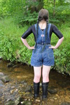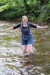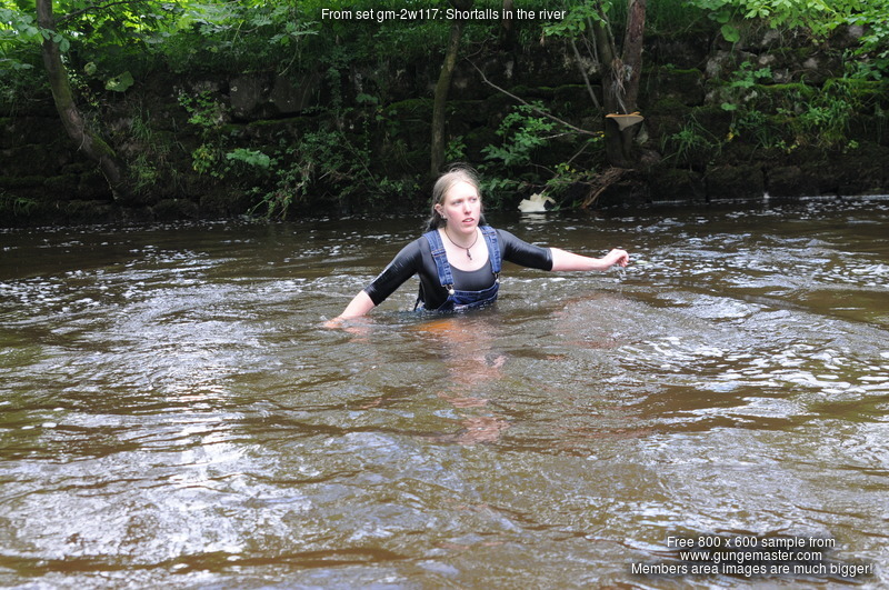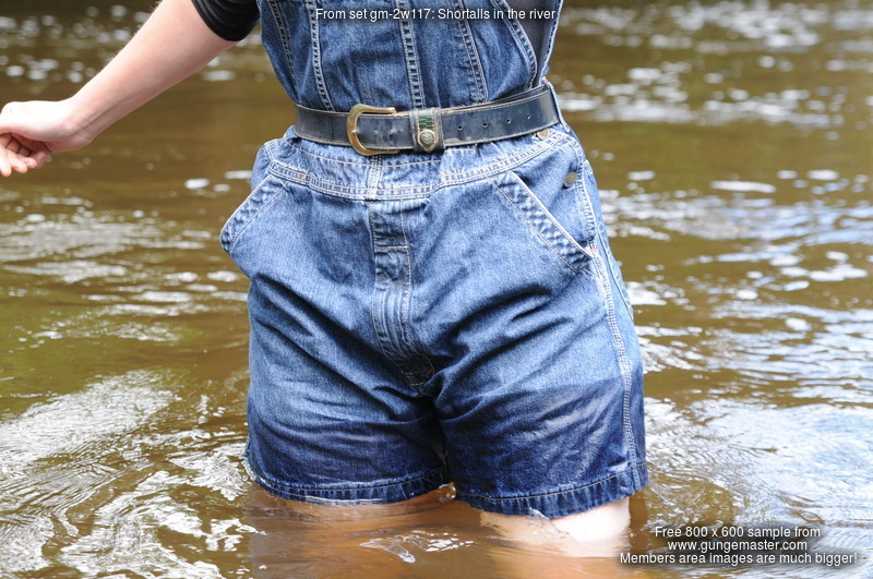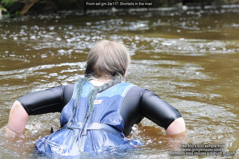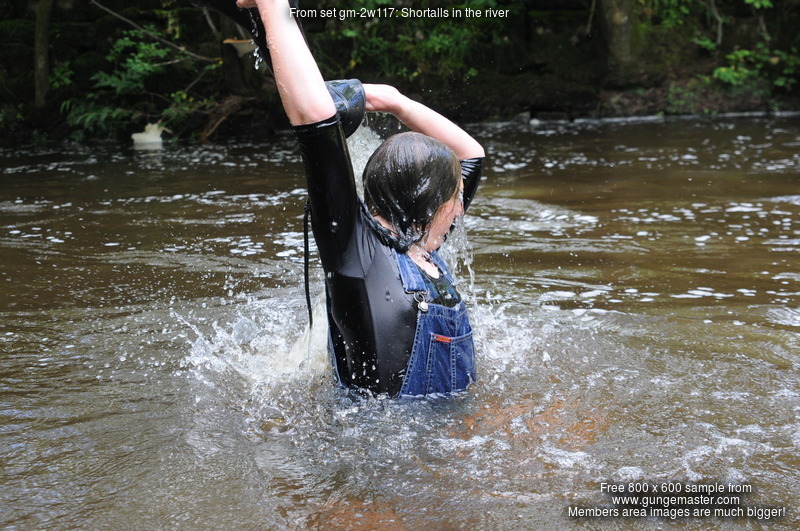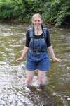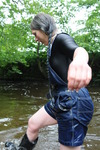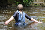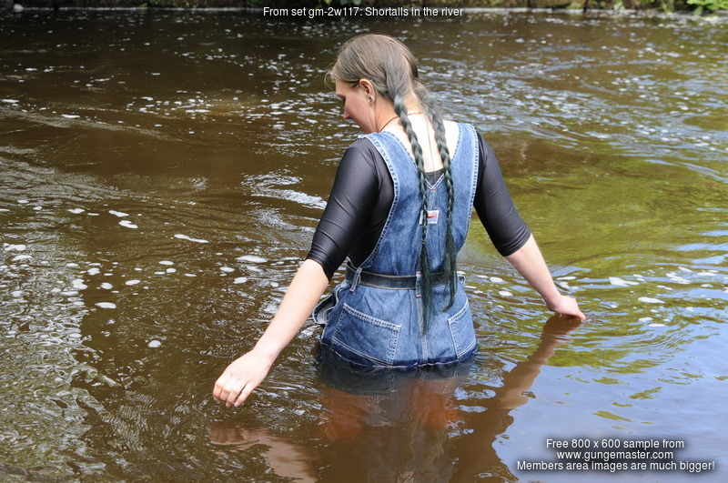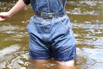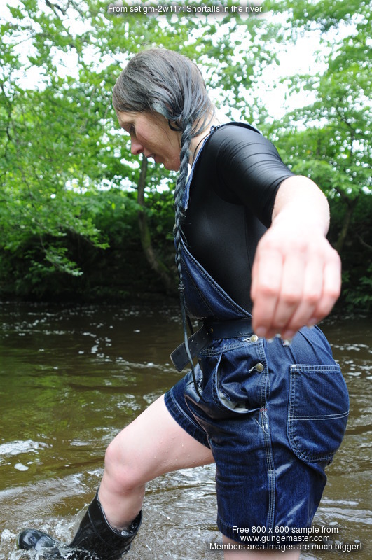 Dressed in black spandex long-sleeve top under short denim dungrees, belted in at the waist, and with Dunlop wellies on her feet, Purity takes a dip in the river by the viaduct. She floods the wellies almost as soon as she steps into the water, but her dungaree shorts and top stay dry for a little longer, till she wades deep enough to start to wet the dungarees, and then on down and in she goes till she's swimming in the deep pool and her entire outfit is drenched!