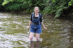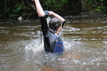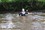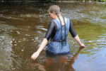 She spends quite a while in the water, playing, splashing, larking about, all the while wearing her drenched clothes and water-filled boots. At one points she takes a welly off and pours the contents over her head, all the while standing in waist deep water.