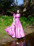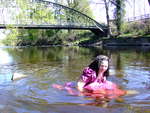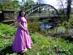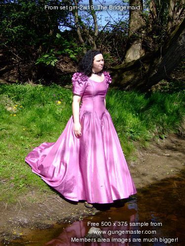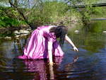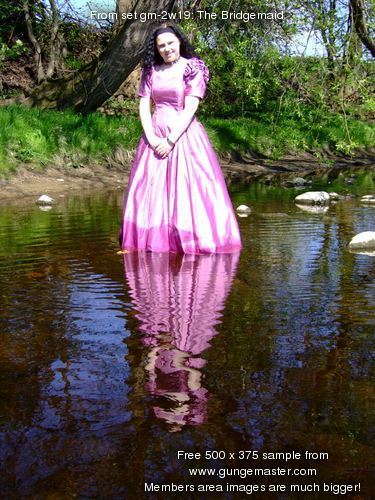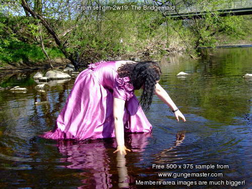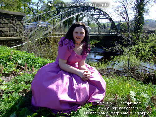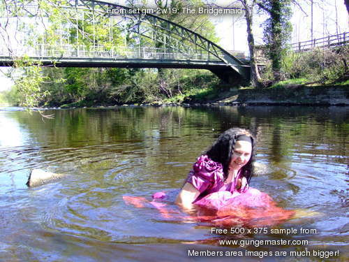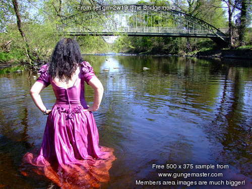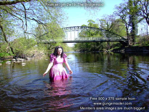 Come and join Wendy, in a fabulous pink bridesmaids gown, as she goes for a deep paddle in the river as it flows onwards from the Dale towards the wide Vale of York. No longer the babbling brook of the Upper Dale, now it's a river, wide and deep, and spanned as it leaves one of the pretty market towns on the edge of the hills by a beautiful wrought iron, arch-suspended Victorian road bridge, which forms the perfect backdrop to Wendy's dress-wetting fun.