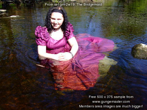 Slowly our lovely lady wades into the water, gradually wetting more and more of the beautiful material until the skirt is completely soaked and the river is lapping at her bodice. Then she plays, splashing water, bobbing up and down, and clambering around the rocks below the surface. Eventually, the dress is drenched completely, and Wendy poses to show off her wetness.