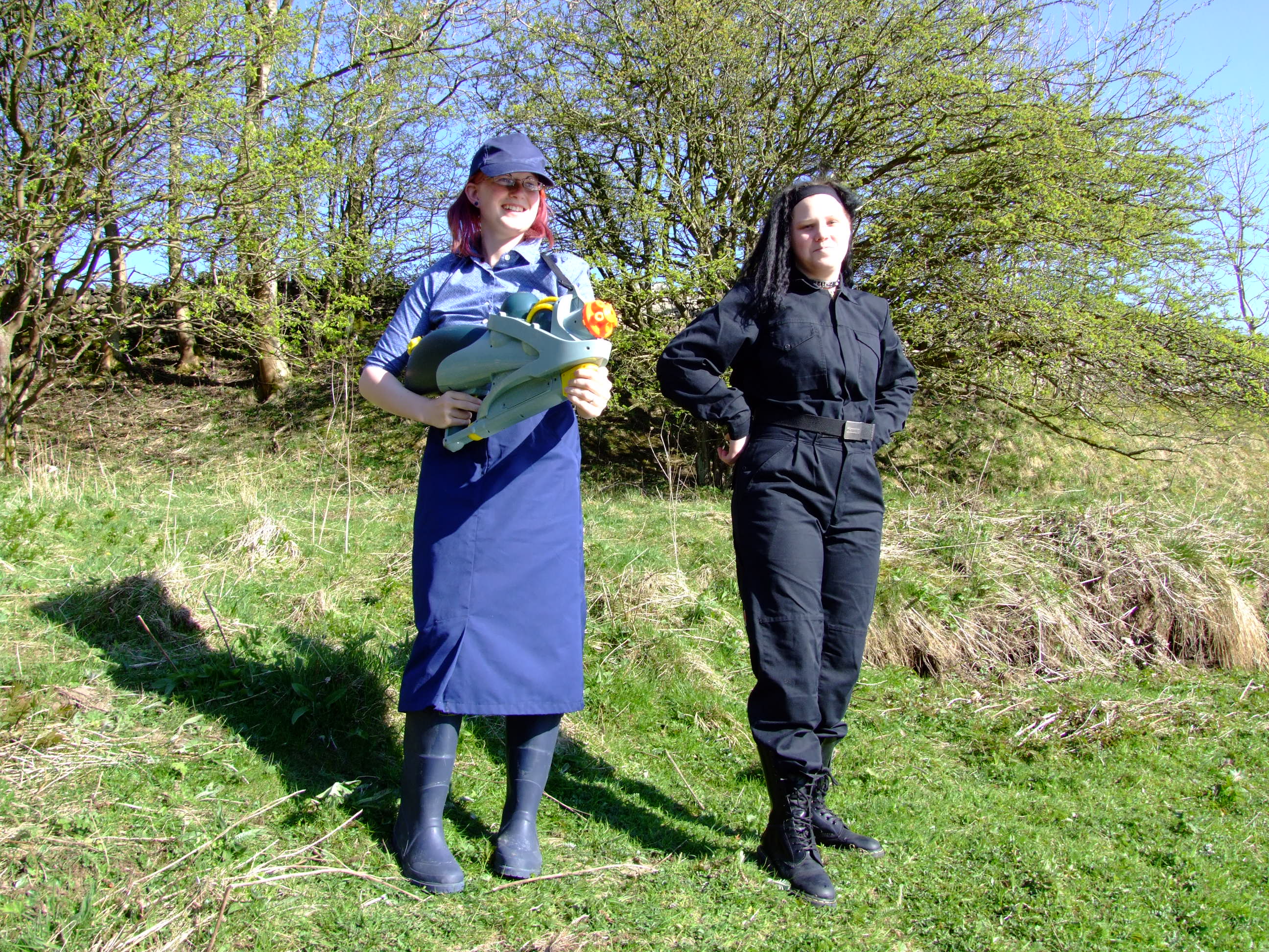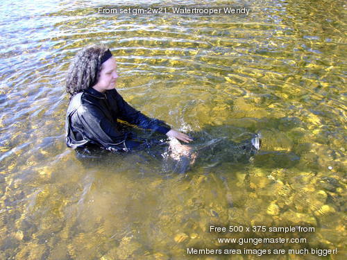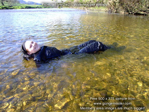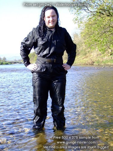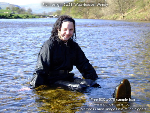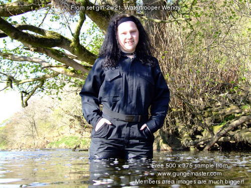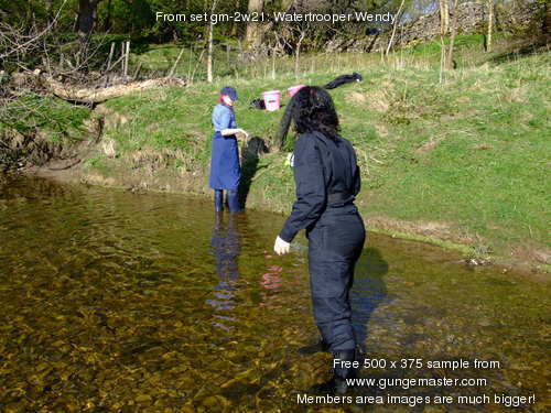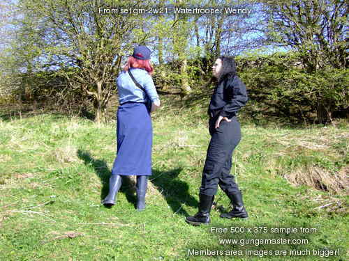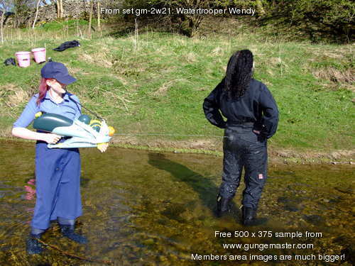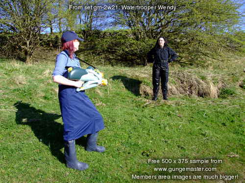 Early Spring on the banks of the river below the village, and Wendy and Miss Pink are enjoying the warm weather to the full. Wendy has broken out her "watertrooper" uniform, black boilersuit, black boots, and huge water-gun! But she decides to find out for herself what it's like to be on the receiving end of a supersoaking hosedown, passes the loaded gun to Miss Pink, and tells her to let rip!