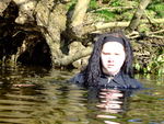 While Miss Pink reloads, Wendy goes for a paddle, wading deeper into the water, slowly going deeper and deeper into the water, soaking legs, trunk, waist, chest, and eventually going neck-deep in the water, drenching her well-fitting suit entirely. She plays in the water among the trees overhanging the river for a bit, then comes back out to lie down in the water within range of Miss Pink, who opens up on her again with the water gun, splashing the already soaked Wendy at maximum range.