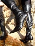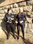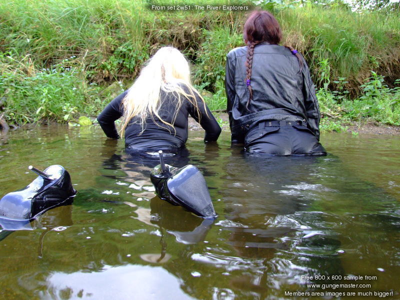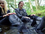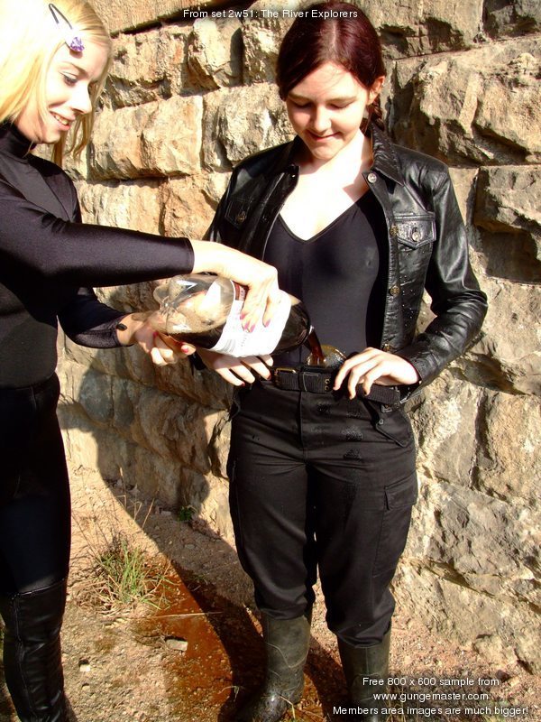 Chastity, in black combats, top, jacket, and rubber boots, and Modesty, in head to toe black spandex and kinky thigh-high chrome-heeled leather boots, go exploring the river together. But before they can enter the water, their clothes must first be drenched with bottles of fizzzy drinks, which they take turns pouring into each others' outfits.