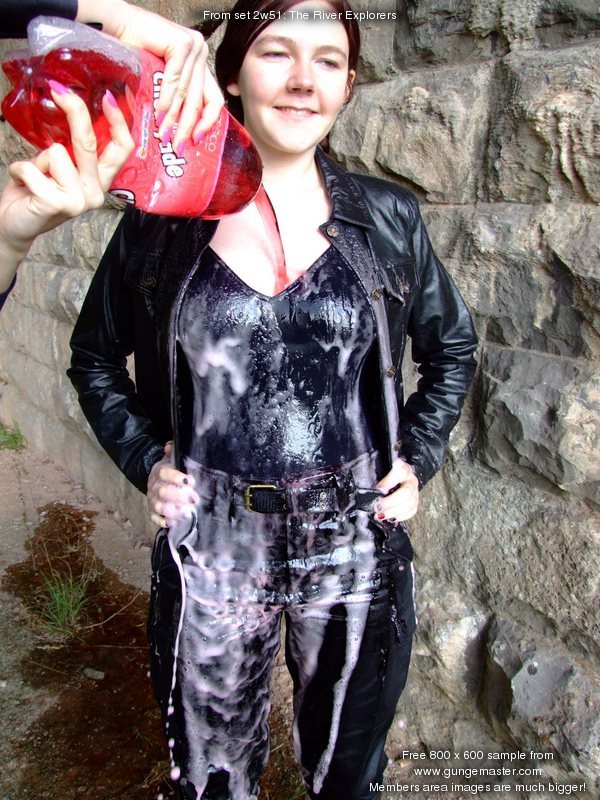 Modesty gets the treatment first, unresisting, she holds her waistband open as two litres of cheap cola is poured into her spandex leggings, fizzing and soaking its way down through the shiny fabric, and over and into her thigh-boots. Then it's payback time, and Chastity stands unresisting as bottles of cola are poured down her front. For the first one, she's allowed to keep her black leather jaket zipped up and the cola foams and flows all over the leather. Then however she opens her jacket, pulls out the waistband of her black combats, and has the entire contents of a second bottle emptied into her trousers, filling and drenching them, foaming and fizzing through the dark material, and collecting round her feet in her black wellington boots.