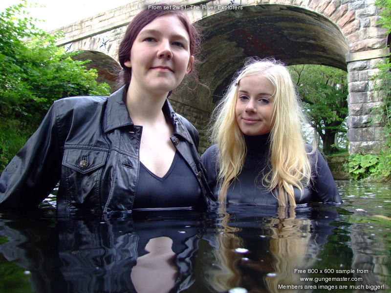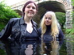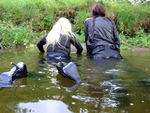 There is a bit of hugging and posing in their fizz-wet clothes, and then the two girls take to the river, where they do more clothes filling of each other with a watering can and river water, before wading deep into the water. They wade in and out of the deeps a couple of times, and they play with Modesty's thigh-boots while she's wearing them,, filling them up with the watering can until they colapse down her leg to become water-filled ankle-boots!