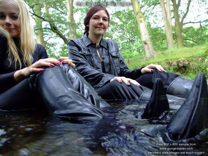 They play in the water for quite a while, wading, sitting, splashing each other, before eventually climbing back out and posing, dripping wet, sitting on the rail fence that guards the road. Where they empty Chastity's rubber boots over themselves!