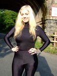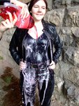 Now it's Modesty's turn to be on the receiving end again, and she holds the neck of her skin-tight spandex top open to have another two litres of fizz poured inside and down her front, flooding through the top and adding to the existing fizzy wetness in her leggings and boots. Then Modesty turns round, bends forwards and has another bottle poured over her back and bottom. Next the girls give each other a down-the-front dowsing with bright red cherryade, and then to finish, they do it again, simltaneously, pouring bottles over each other at the same time.