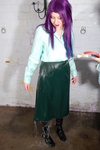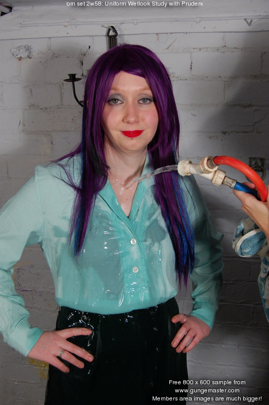 Join Prudence, smartly dressed in bottle green knee-length skirt, pale green blouse, and black leather boots, for a slow and careful fully dressed hosing down, as she checks if this outfit is suitable for Hall staff to wear wet.