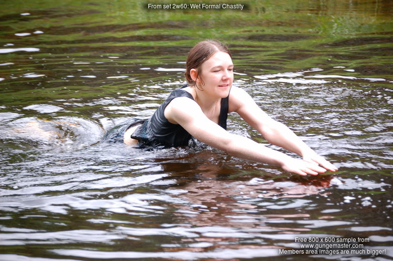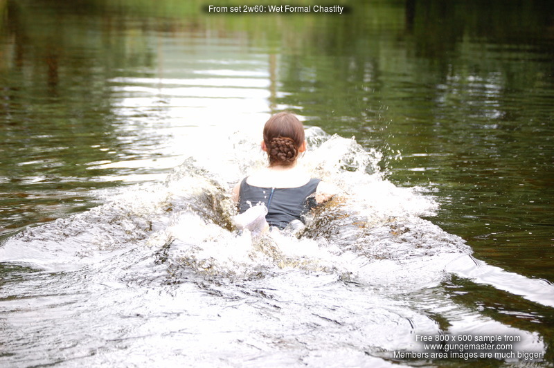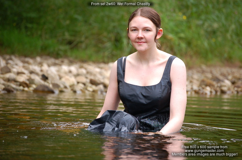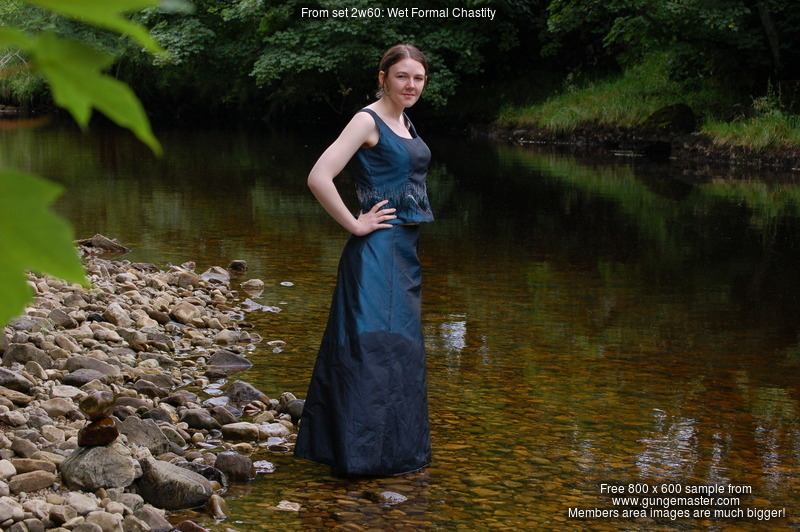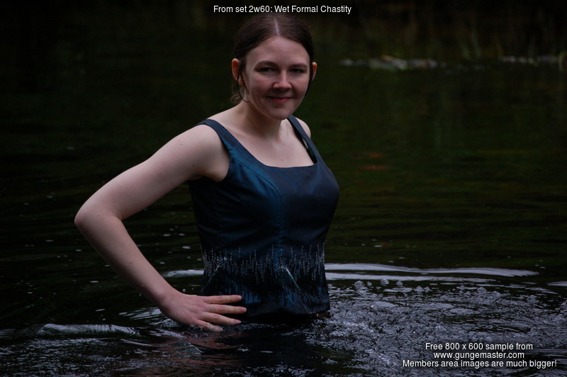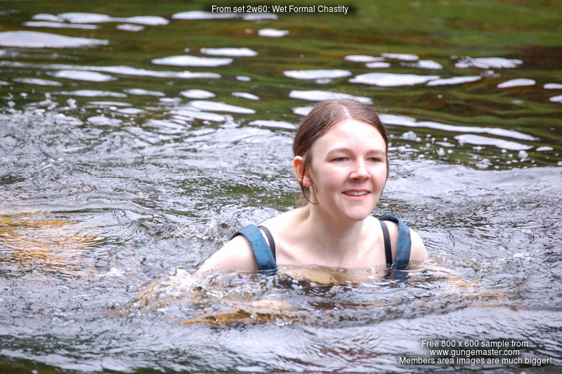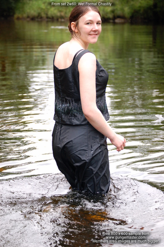 Technical: Note the video for this scene is tripod-shot and not as close up as some of our more recent productions, in particular Chastity initially wades into the deep pool quite far from the video camera. You can still clearly see her wading into the water and it rising up her clothes, but she's 20' from the camera. However she then comes up close, soaking wet, and plays and poses in the water directly in front of the camera. This was one of our very first attempts to include video in an outdoor wetlook shoot.