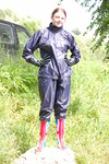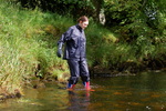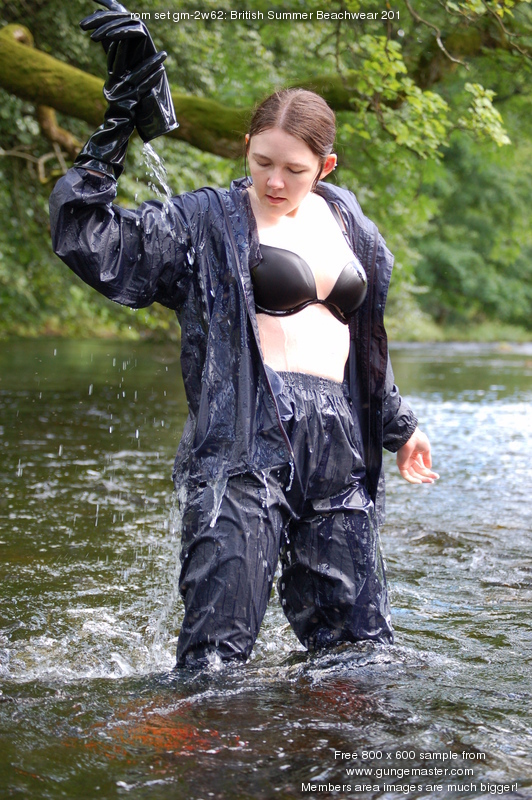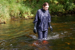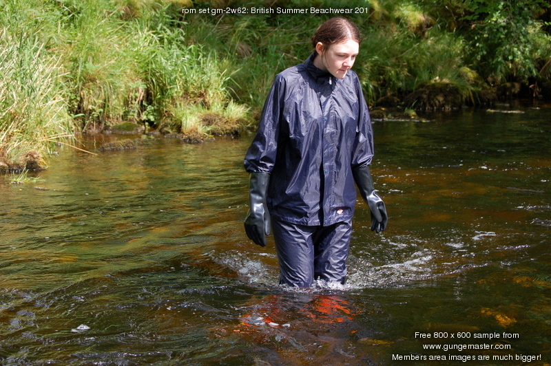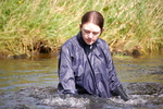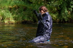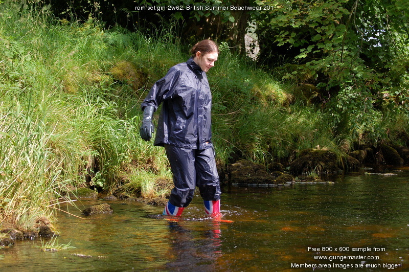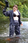 Chastity wears a black bikini, dark blue waterproof trousers, dark blue waterproof jacket, big black rubber gloves, and union jack wellies, and goes wading, paddling, and lying down, in the clear waters of the river below the Hall. Towards the end of her paddle, she unzips her waterproof jacket for a bit, and then zips it up again.