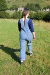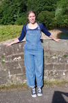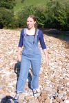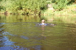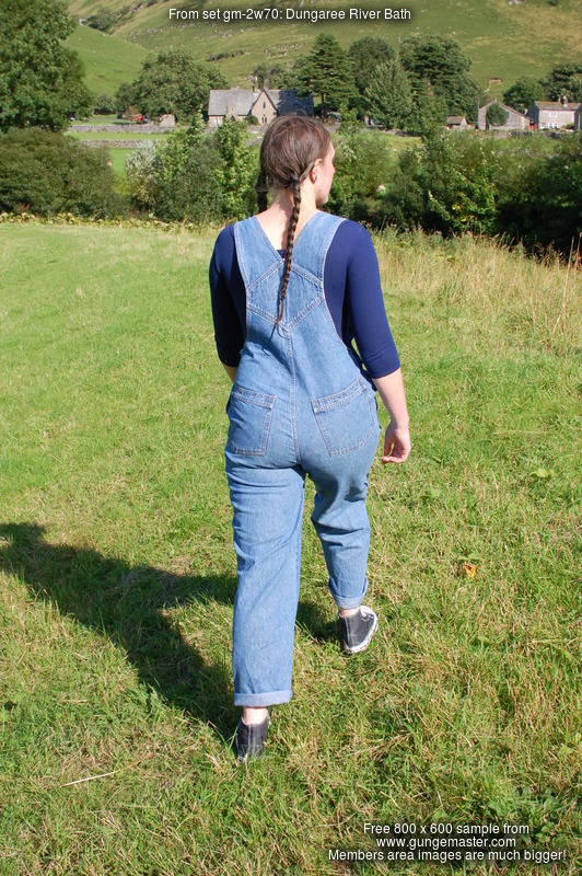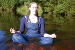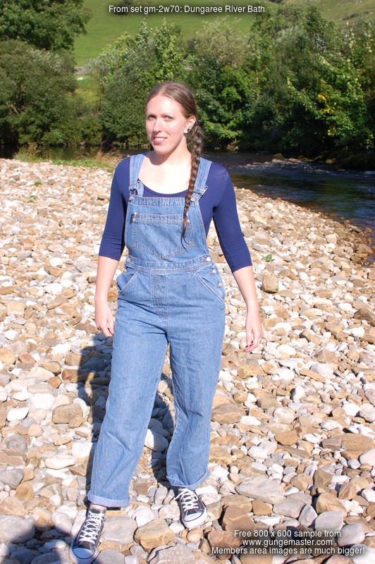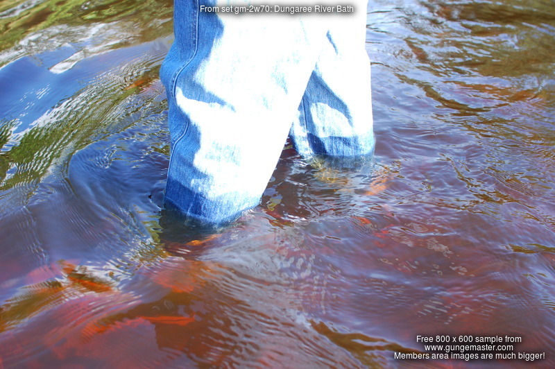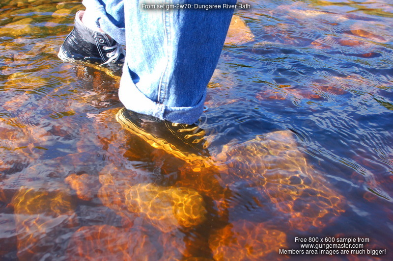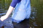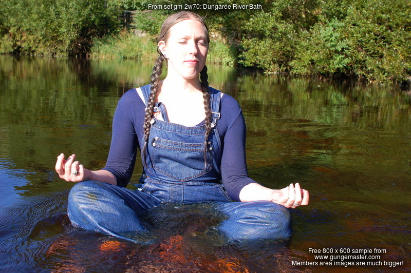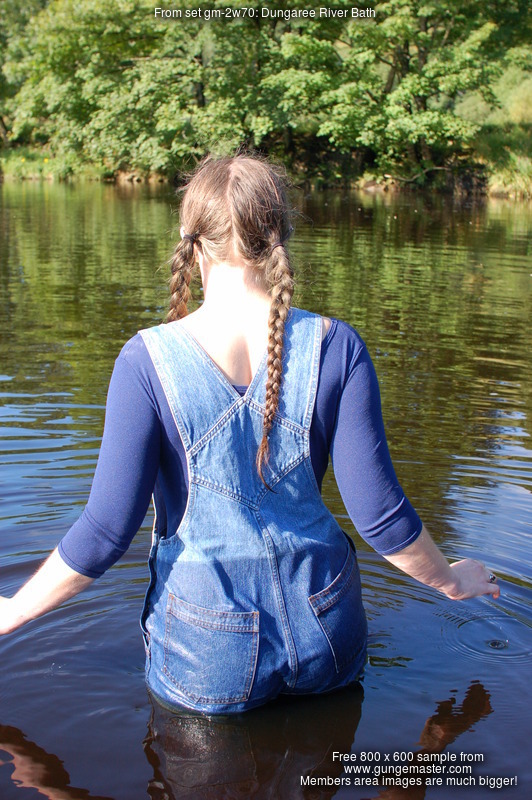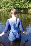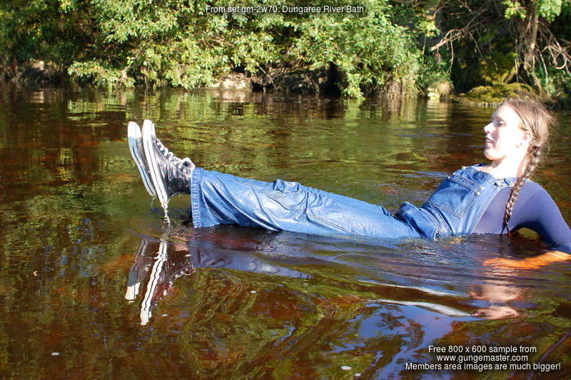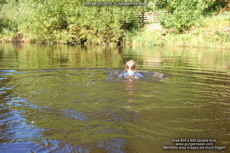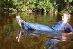 Purity, dressed in leotard, denum dungarees, and Converse style boots, wades waist deep into a pool in the river, ducks down, swims, and then releaxes, soaking wet, in the shallows.