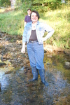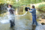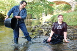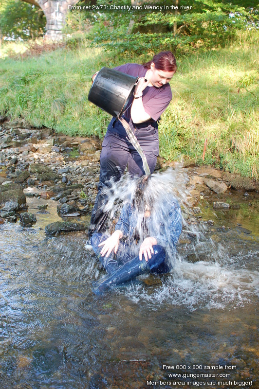 They cross the river at a shallow point, Evelyne's wellies keeping her dry for now, while Wendy just splashes into the water and soon has her trouser bottoms wet. Evelyne's dryness doesn't last long though, as she sits herself down, cross legged, in the shallow water, soaking her bottom. And then Wendy starts pouring buckets of water all over Evelyne, including right over her head! In seconds Evelyne is completely drenched, head to toe.