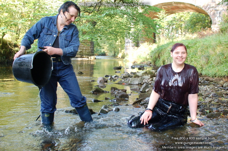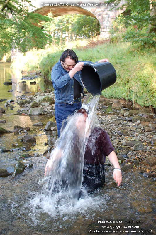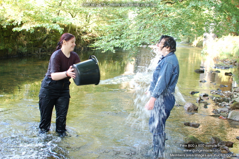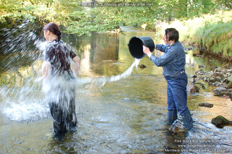 Once they are both completely soaked, the two ladies wade calf deep in the river, and take turns throwing more buckets of water over each other, full force soakings, no holds barred, the receiver in each case unresisting, taking her drenching like a woman, with no attempts to block or hide behind arms or hands. They each turn round too, and take a full force bucketing to their backs as well as face-on.