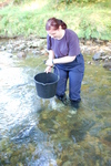 Of course one good soaking must lead to another, and so Wendy takes her turn sitting down in the river, to receive her own buckets of water at Evelyne's hands.