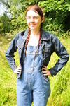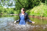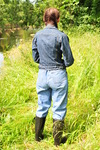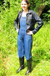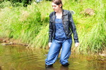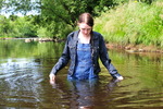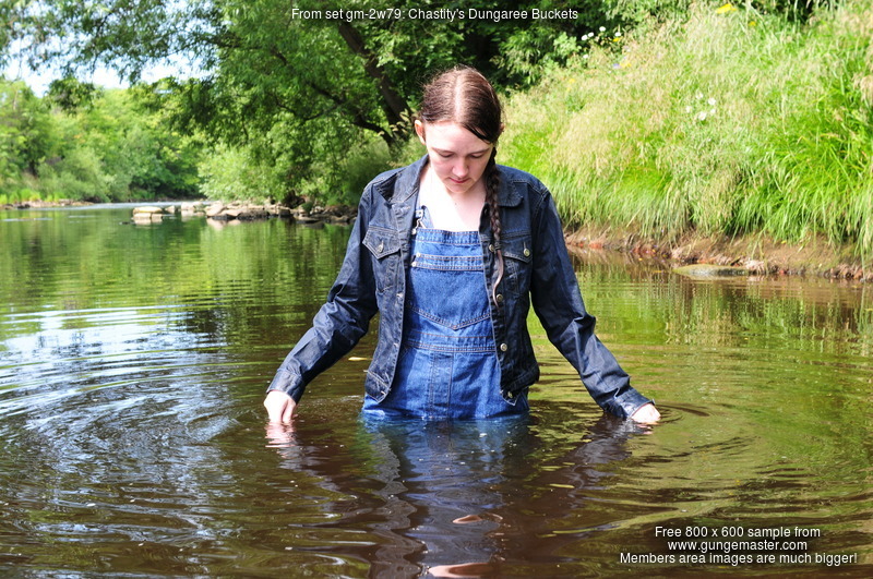 Dressed in denim dungarees, t-shirt, wellies, and a denim jacket, Chastity stands, all dry, by the riverbank. Should she go for a paddle? But that might get her clothes wet, so lets avoid that problem by getting her totally soaked where she is standing, so she'll already be nice and wet when she goes into the water.