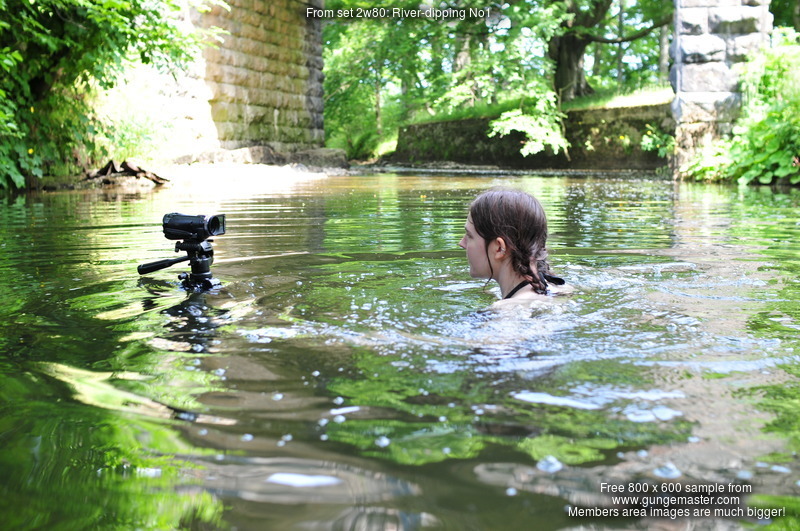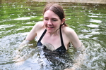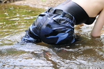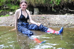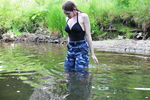 Chastity, dressed casually in black swimsuit, blue urban combats, and union jack wellies, wades chest deep in the estate river, soaking her outfit completely and going into and out of the water several times, showing off her soaked clothes. Once she's totally drenched, she plays in the water, bobbing in the deep area and then sitting in the shallows, legs and bottom in the water.