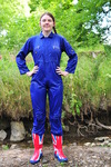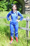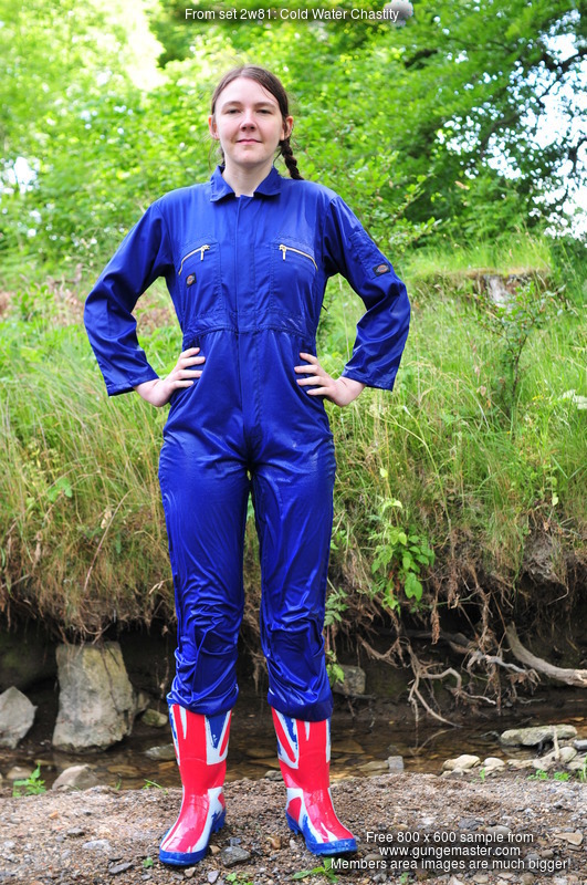 Here we see her giving one of her working outfits a complete drenching, wading into the cold waters of the estate river in a royal blue boilersuit and union jack wellies.