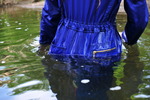 Starting on the riverbank, all dry, Chastity wades down a slope into the river, the water rising up her boots, flooding them, and then rising up her legs and trunk with each step. On her first wade in, she wets herself to just below her shoulders before turning and walking back out again. Then she wades back in, going all the way to her neck this time. Again she wades back out, and sits down in the shallows, before sliding down into the deeper water again on her bottom. She goes in and out of the water again, with close-up shots showing her drenched bottom and legs emerging from the river.