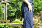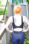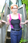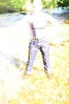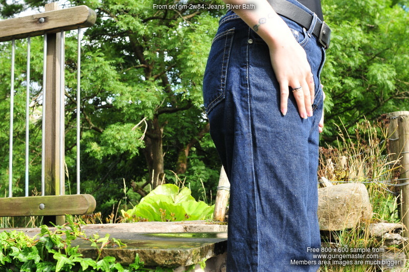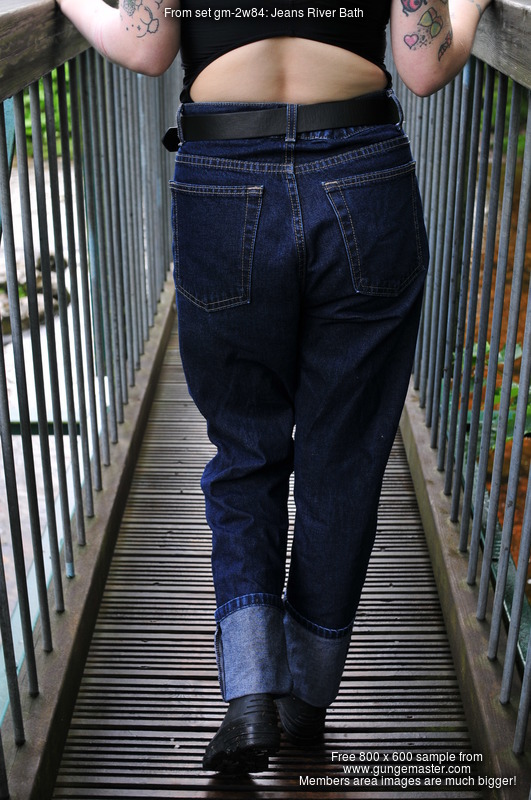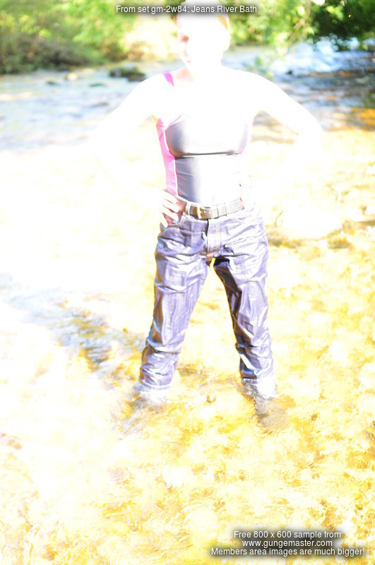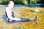 Dressed in black and pink swimsuit, boots, and blue jeans with large turn-ups, our security chief Kitty Kodena takes a very cold river bath on the estate in early Spring.