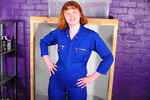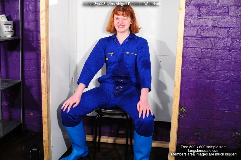 In this scene Miss Abigail gets well dripped on, and then totally drenched three times, and soaps herself up with lashings of shampoo between the first and second, and second and third, delugings. After the first few drips she gets up to put a tray on the seat, which she allows to catch the drips for a while before sitting back down again, soaking her bottom. She's wearing her boilersuit commando, no underwear, so you know she's feeling every drip and squelch. After the main drenchings she stands up and stretches to put the tank plug back in so it can start refilling again, we get nice views of the tight-fitting, soaking wet suit hugging her bottom each time she does this. As well as soaking up her suit she also gives herself a thorough hairwash, using the following deluge to rinse her hair clean again.