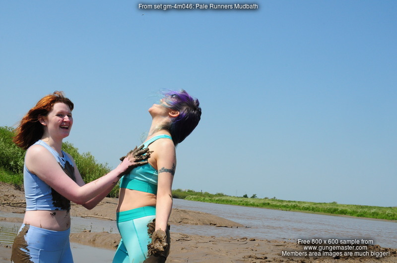 Dressed in beautiful skin tight running gear, running pants and matching crop-tops, pale blue for Miss Abigail and pale green for Lady Jennifer, both with trainers worn sockless, and no underwear to spoil the lines, our two sporty wenches throw themselves and each other into the mud!