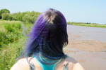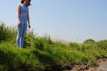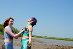 They jump in together but both manage to remain upright to start with. So a quick game of Scissors Paper Stone decides who is getting pushed in first, the looser willigly allowing herself to be pushed over, bottom going squelch into the gloopy riverbank mud. Fair's fair so the winner soon takes her turn to get pushed in too.