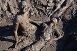 Eventually, when they've finally had enough of rolling around and over each other in the mud, they slide down the bank into the river, still fully clothed, for a rough wash-off and final wet and messy hug.
