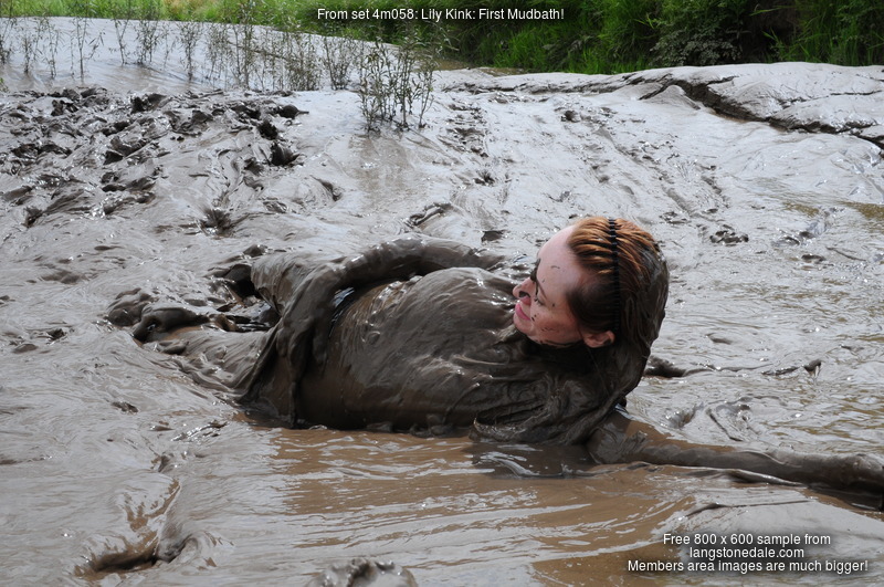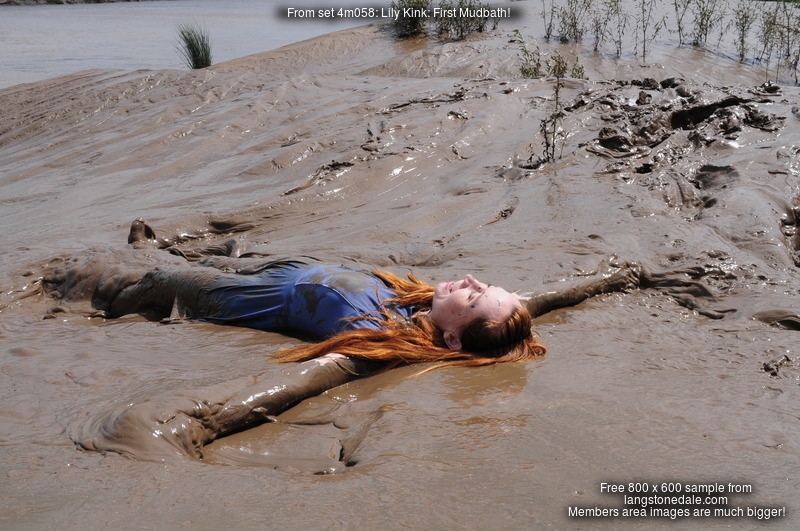 Lily Kink has done mud before, but had never been our gloriously creamy Marsh House musbanks, so this was very much a mud baptism. We have her a free choice of first outfit into the clay, and she picked one of our very fetching swim dresses, effectively a zip-front swimsuit with an attached miniskirt, and barefoot to really feel the mud between her toes.