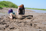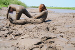 They jump in together but both manage to remain upright to start with. So a quick game of Scissors Paper Stone decides who is getting pushed in first, the looser willigly allowing herself to be pushed over, bottom going squelch into the gloopy riverbank mud. Fair's fair so the winner soon takes her turn to get pushed in too.