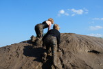 The mud was deep and thick and sticky this day, Roxanne goes in first, wading into the gully-bottom pool, getting rather stuck, and then falling back to sit with a splat in the mud, coating the seat and back legs of her cargo pants while her boots completely disapper in the gloop. Then she sits on the side of the gully and invites Aurora to join her, which Aurora does by dropping to all fours and crawling down the slope, the mud getting softer and wetter as she goes, until her hands, and those lovely suede boots, are being engulfed as she reaches the bottom of the gully and crawls forwards into the thick deep liquid mud.