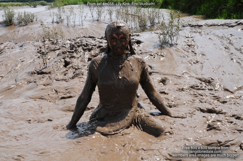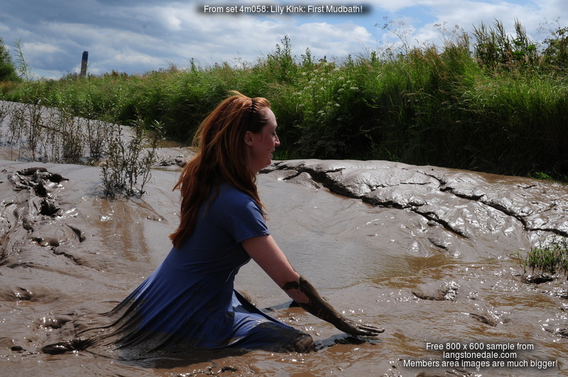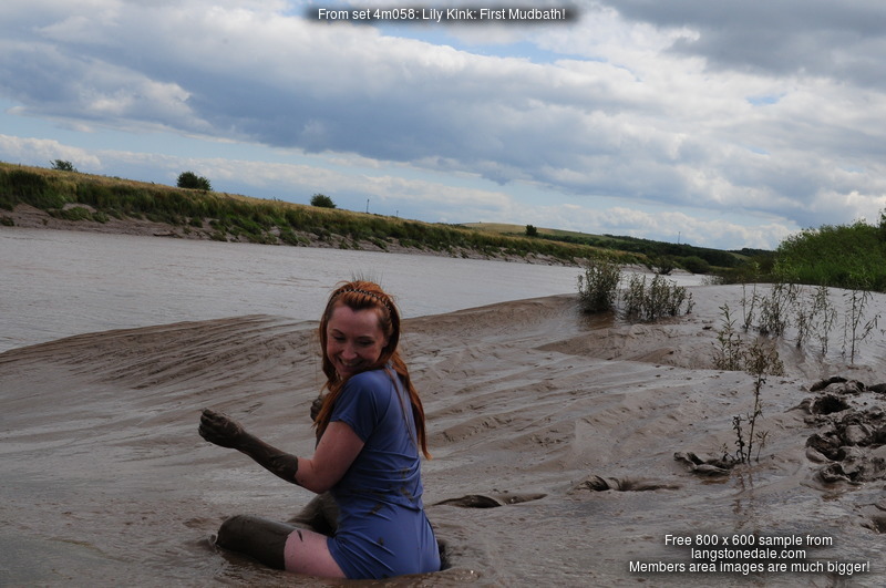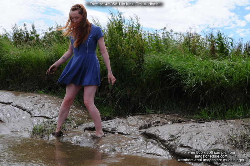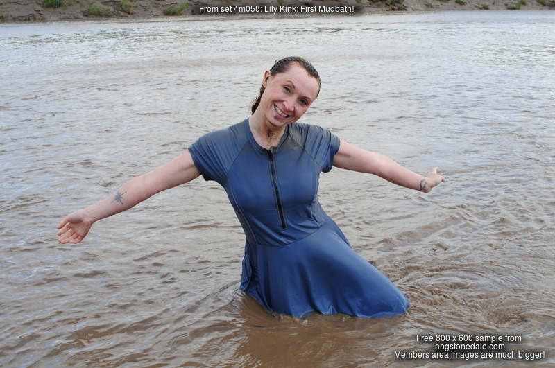 Lily Kink has done mud before, but had never been our gloriously creamy Marsh House musbanks, so this was very much a mud baptism. We have her a free choice of first outfit into the clay, and she picked one of our very fetching swim dresses, effectively a zip-front swimsuit with an attached miniskirt, and barefoot to really feel the mud between her toes.