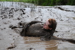Eventually she slides down into the river for a rough wash-off, emerging in her soaking wet and mud-stained swim dress, still barefoot.