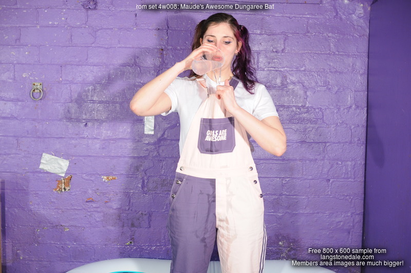 Dressed in pink and purple Adidas "Girls are Awesome" dungarees and lace-up plimsolls, Maude steps into the water in the dungeon pool and proceeds to get absolutely soaking wet! She pours water down inside her overalls, then sits down in the water and soaks herself completely before playing and splashing and just having a brilliant time being utterly soaked in her overalls and t-shirt.