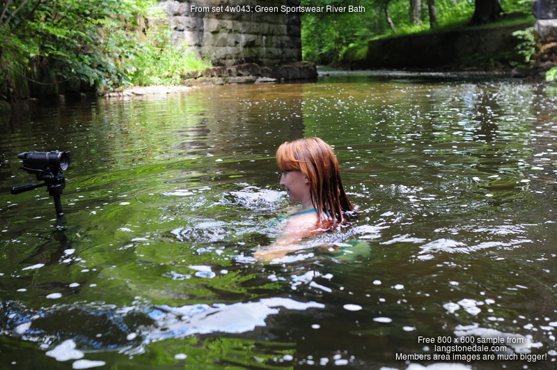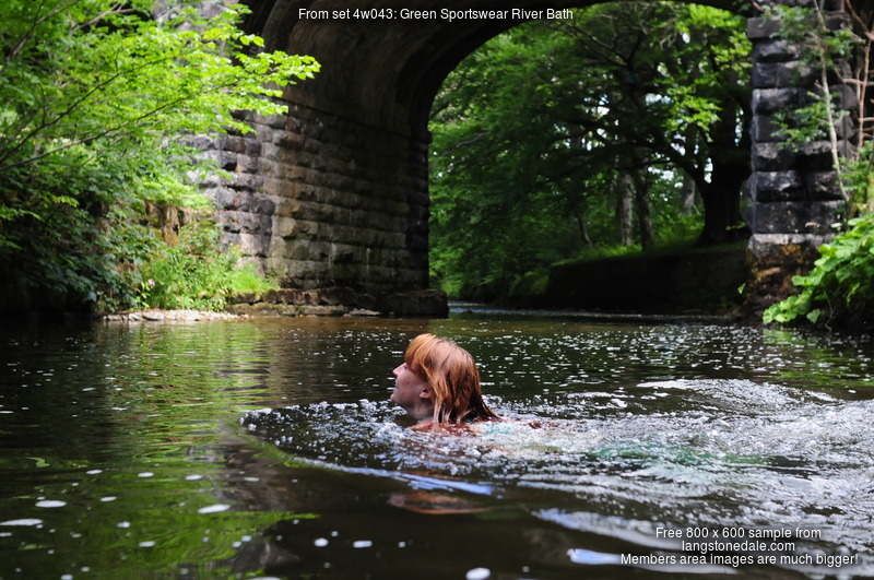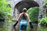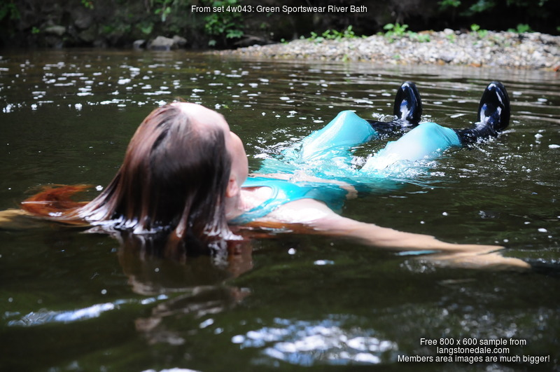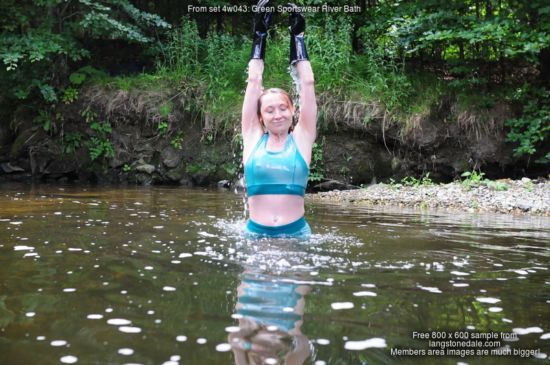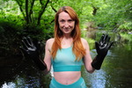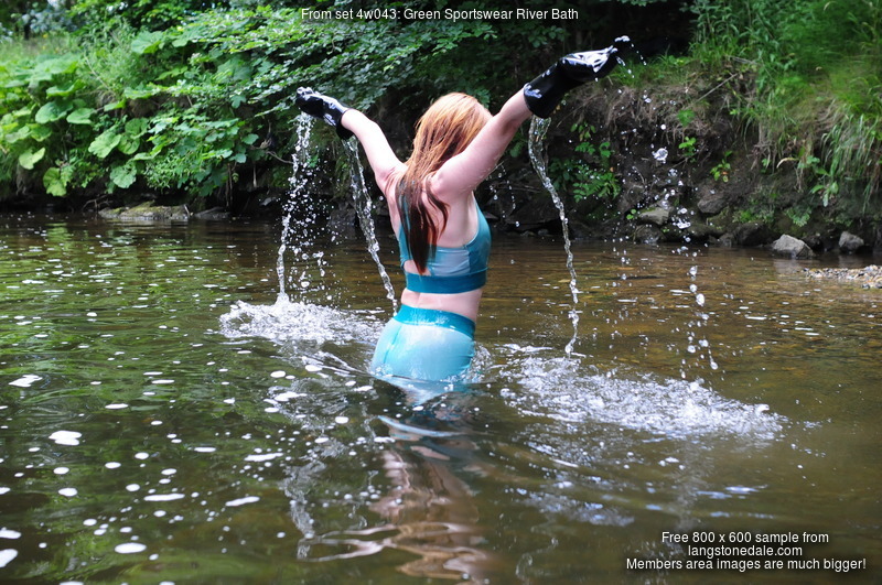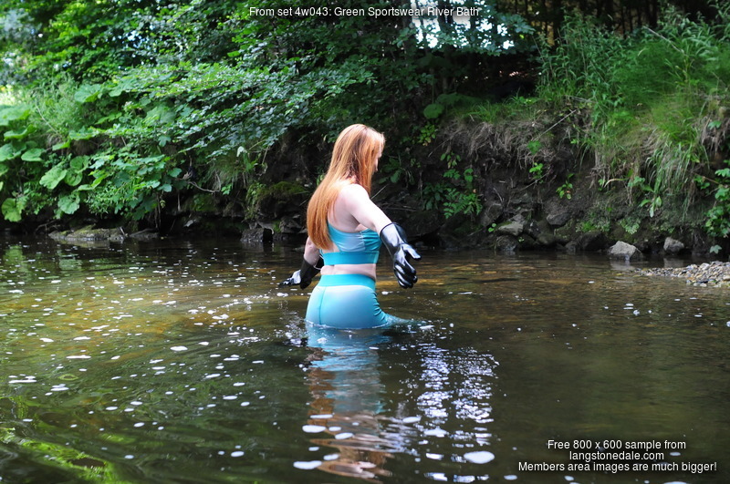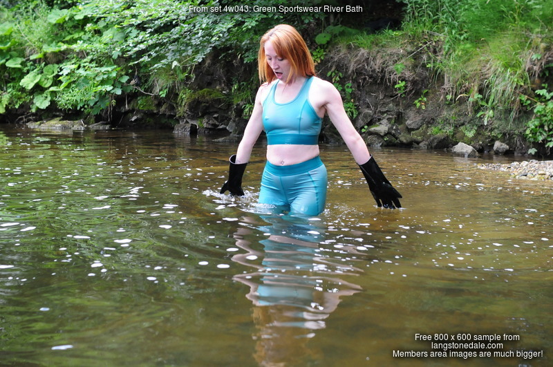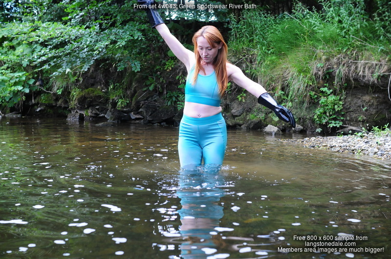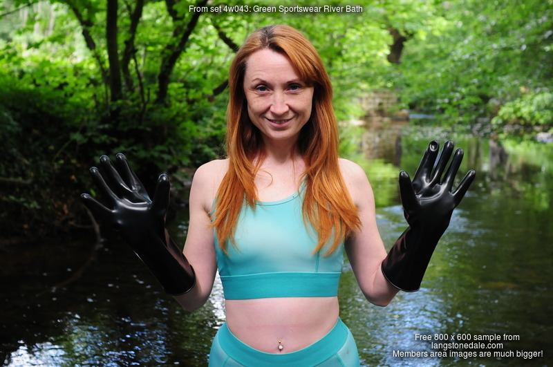 As High Summer approaches in Langstonedale, Lily has decided it's time for some fully clothed soakings. Today she's going to take to the estate river by the viaduct while dressed in skin tight pale green running leggings and matching bra-top, but finished off with rubber riding boots and big black rubber gloves, just to make things a bit kinkier.