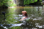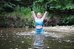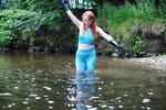 She wades into the water, exclaiming a little as the cold river floods her boots, soaks herself to the waist, turns and wades back out showing off her glistening wet leggings, then comes back in and soaks herself completely.